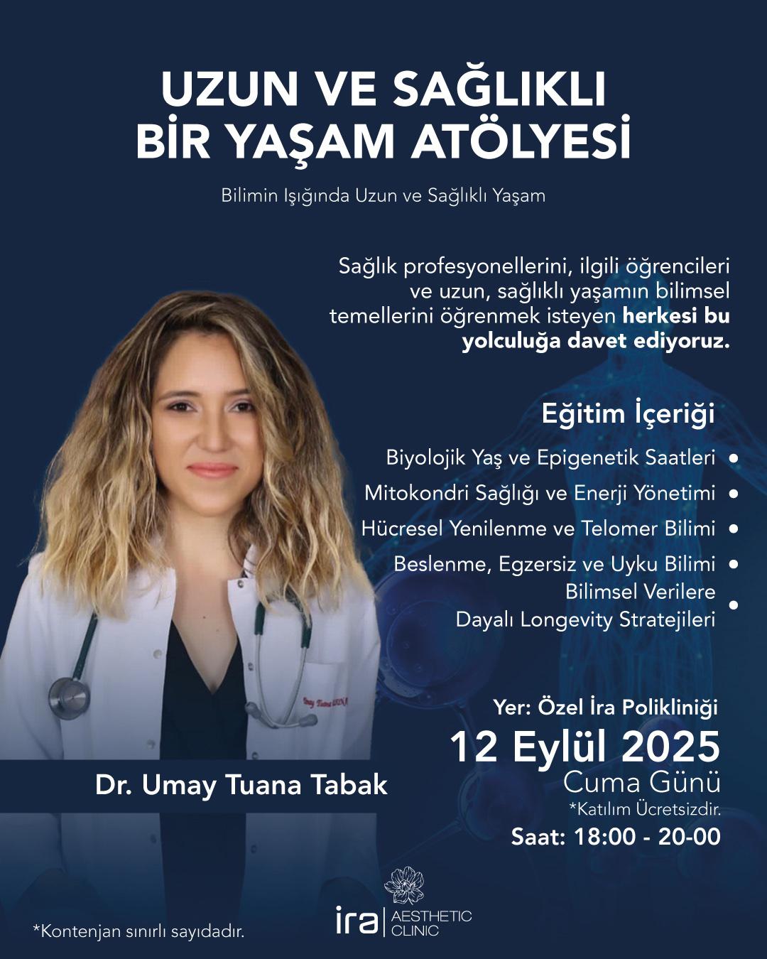Etkinliğin uzman eğitmeni Dr. Umay Tuana Tabak, uzun yaşamın bilimsel temellerini sade ve anlaşılır bir dille aktardı. Sunumda öne çıkan konular şunlardı:
